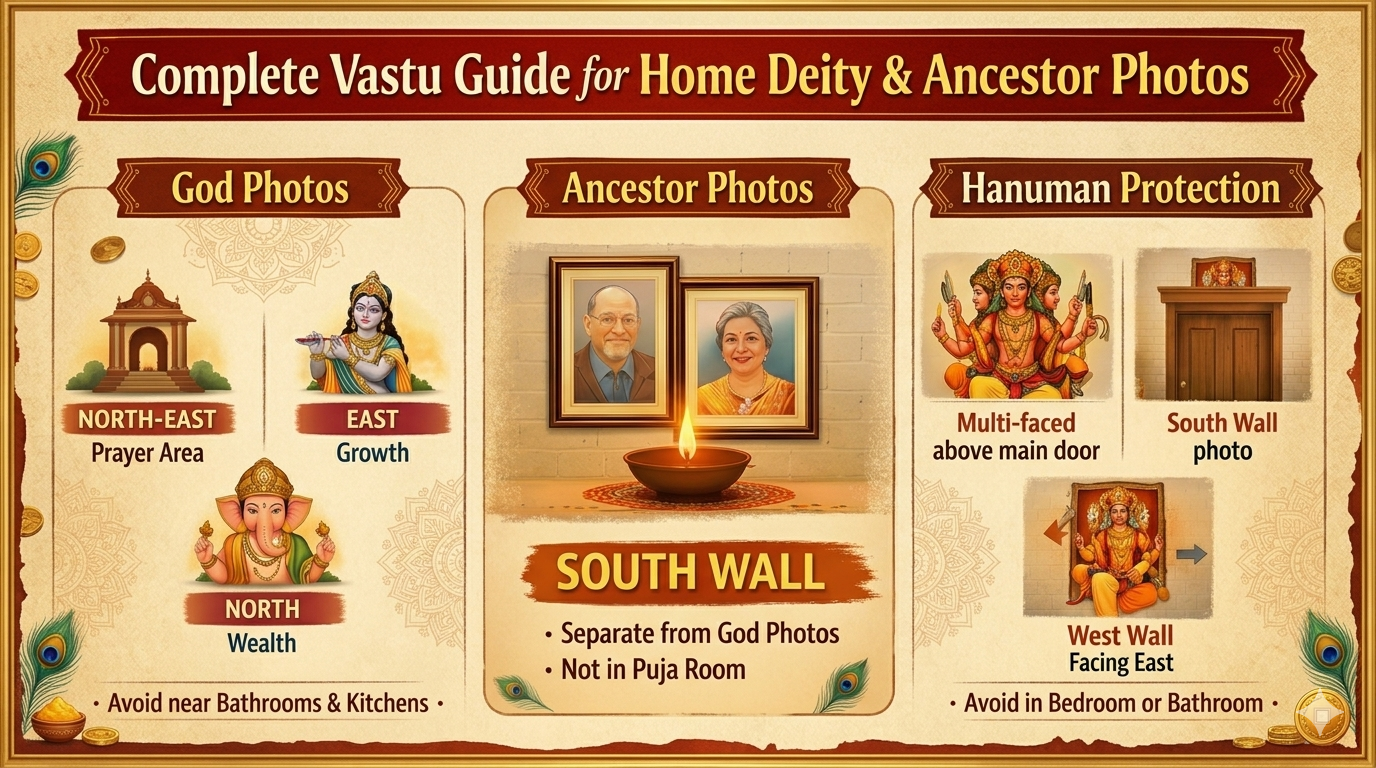 Q2: Which way should I face when praying? Face East for health or North for money and success. Q3: Can I put photos of my Guru in the Mandir? Yes, but keep them a little lower than the photos of the Gods. Q4: Where do I put Ganesh ji on the main door? Above the door. Remember to put one inside and one outside, back-to-back. Q5: Is it okay if the wall is shared with a toilet? Try to avoid it. If you can't, use a wooden board so the photo doesn't touch the wall. Q6: Can I keep "angry" looking God photos? No. It’s best to keep peaceful and blessing versions of deities at home. Q7: How many ancestor photos can I have? Don't overdo it. Just keep photos of your parents or grandparents.